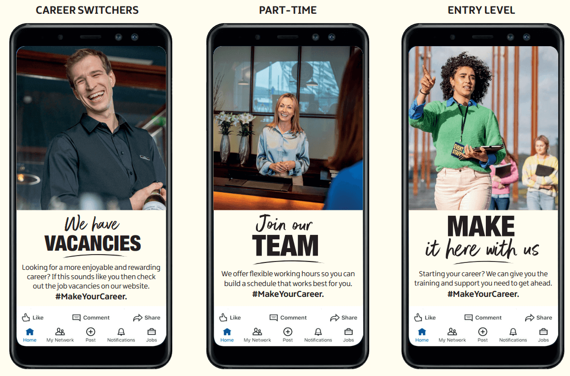 Our research into the world of Tourism & Hospitality has identified key messages and attributes for different sectors, audiences and candidates. You should look to reference these in your social posts to help make your posts more engaging and compelling for prospective candidates. The three examples here will help show you how.