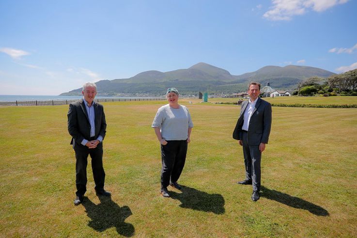 Actress Siobhán McSweeney; pictured with John McGrillen, Chief Executive of Tourism NI (left); and Shane Clarke, Tourism Ireland’s Director of Corporate Services, Policy & Northern Ireland (right), during filming for Exploring Northern Ireland with Siobhán McSweeney, in Newcastle, Co Down.