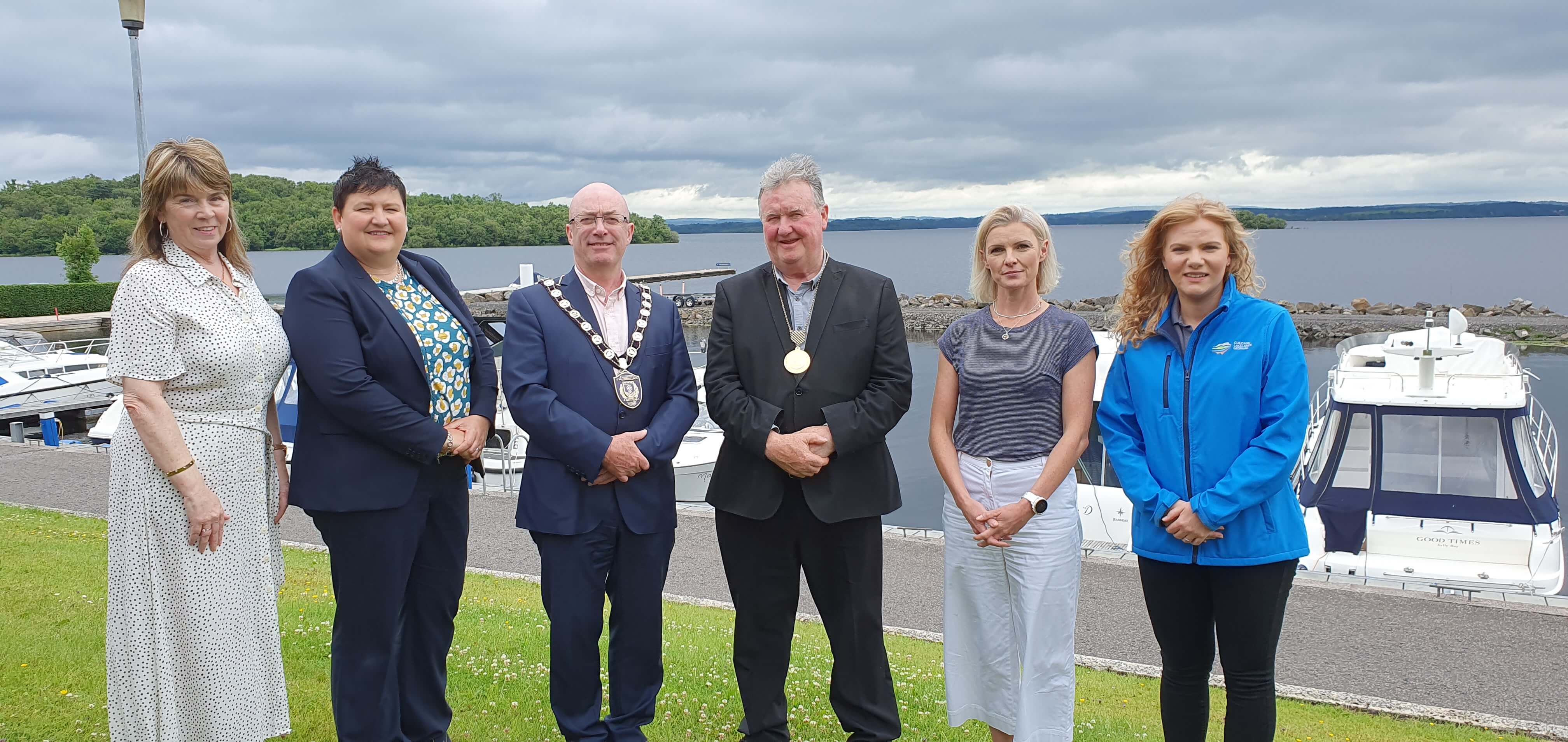 From L-R: Garret McGrath, Regional Manager, Waterways Ireland; Kim McLaughlin, Director of Regeneration and Planning, Fermanagh and Omagh District Council; Councillor Diane Armstrong, Vice Chair, VEDP Delivery Partnership; Councillor Thomas O'Reilly, Chair of Fermanagh and Omagh District Counci; Alison McCullagh, Chief Executive, Fermanagh and Omagh District Council; Ciaran Doherty, Head of Regions, Tourism Northern Ireland