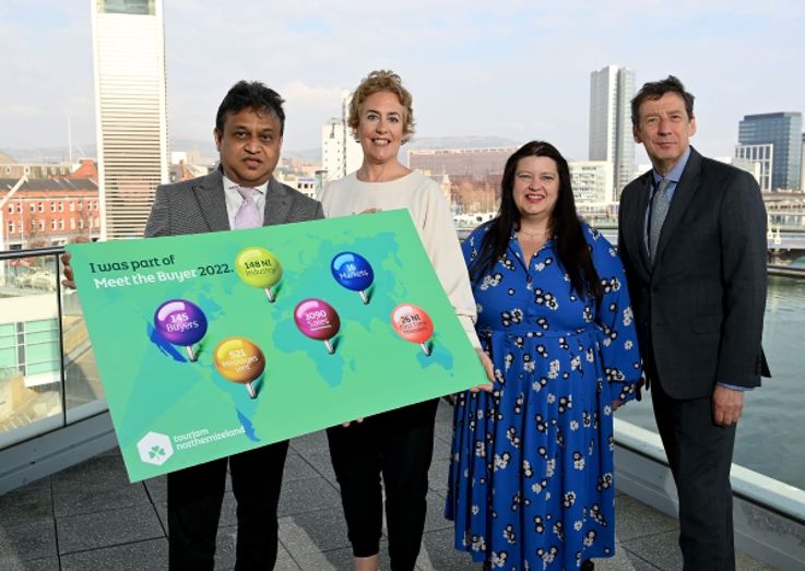 Tourism NI is hosting its first face to face Meet the Buyer trade event after two years of delivering the event virtually. Pictured at ICC Belfast (Left-Right) are Sushant Pilanker, Al Rostamani Travel, Katie Daly, Katy Daly's Travel, Naomi Waite, Tourism NI’s Marketing Director and Shane Clarke, Tourism Ireland's Director of Corporate Services, Policy & Northern Ireland.