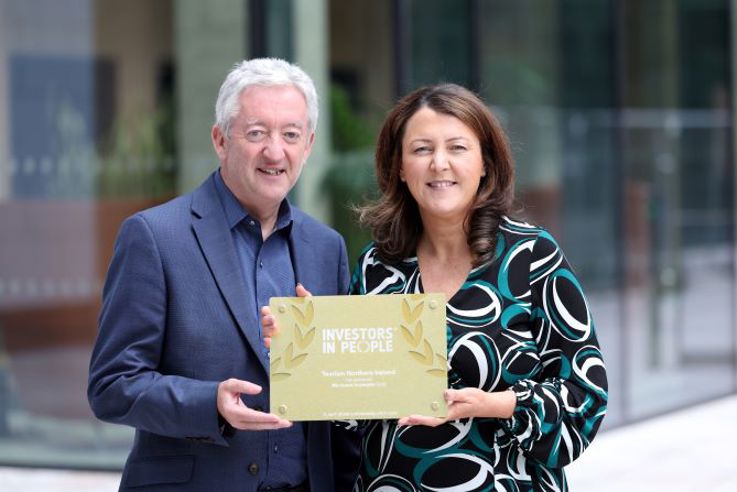 John McGrillen, CEO of Tourism NI and Louise Fitzsimons, Head of People & Organisational Development at Tourism NI, pictured with the organisation’s gold `Investors in People’ award
