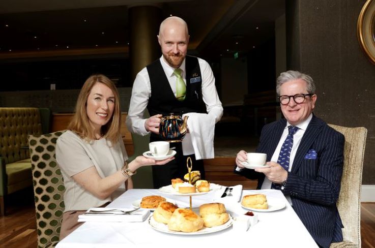 Eimear Callaghan, Head of Experience & Industry Development at Tourism NI, pictured with James McGinn, MD of Hastings Hotels and waiter, Aaron Hughes